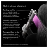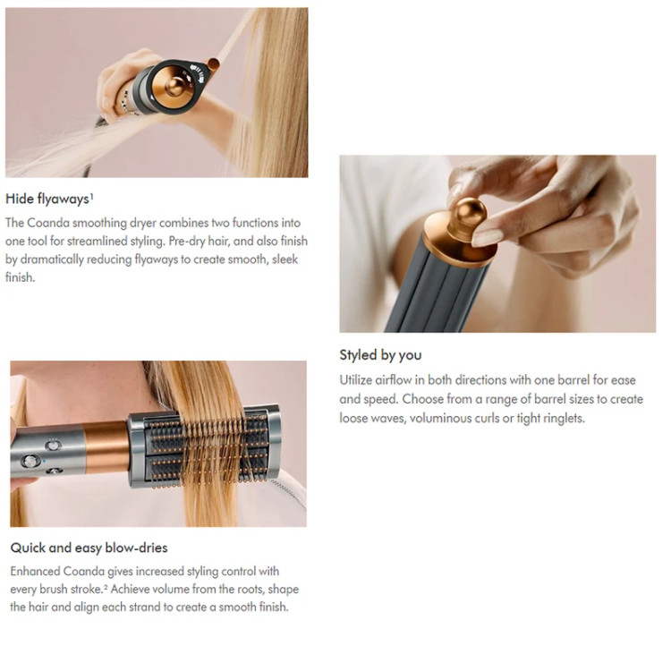 سشوار و فر کننده مو دایسون مدل Airwrap Complete Long Volumise HS05 یکی از قدرتمند ترین سشوار های موجود در دنیا است که طراحی بسیار زیبا و بدنه ای با کیفیت دارد . شرکت دایسون که از پرچمداران و بهترین ها و قدیمی ترین کمپانی های ساخت لوازم برقی انگلستانی است چند سالی است با خاصتر کردن طراحی های خود مجدد به چشم طرفداران این کمپانی آمده است.دایسون با تولید سشوارهای جذاب که علاوه بر کیفیت ، ظاهری شیک و خاص نیز دارند در بین بانوان بسیار مشهور شده است . در طراحی سشوارهای این کمپانی که عمدتا به حفظ سلامت موها بیشتر از کمپانی های دیگر فکر شده است، شرکت به شما وعده داده تا موهایتان با استفاده از این دستگاه ها به هیچ وجه آسیب نبینند و خشک یا شکننده نیز نشود . سشوار و فر کننده دایسون Airwrap Complete Long Volumise HS05 محصولی کامل و فوق العاده است و یکی از کاملترین سشوارهای این کمپانی به حساب میآید . شما با کمک این دستگاه میتوانید استایل موهای خود را تغییر دهید و آن ها را به زیباترین شکل ممکن آرایش کنید . سشوار برس دار دایسون Airwrap HS05 دارای 6 سری متفاوت است که هر کدام به موهای شما حالتی جدید می بخشد . شما با این 6 سری متنوع میتوانید موها را خشک کنید ، فر کنید ، حالت دار کنید و یا به لخت ترین شکل ممکن در بیاورید . نگران نگهداری این سری ها نباشید چرا که این کمپانی به این موضوع نیز فکر کرده است و یک کیس سورمه ای زیبا برای آن ها تعبیه شده که شما میتوانید دستگاه و سری ها را در آن نگه دارید . در کنار تمام این قابلیت ها این دستگاه نیز قابلیت یون سازی دارد و به سلامت بیشتر موهای شما کمک میکند . فناوری هوشمند پروانه 13 پره تا 110000 دور در دقیقه میچرخد و 3.2 کیلو پاسکال فشار تولید میکند و با بهره مندی از موتور قدرتمند V9 میتواند اثر کوآندا را ایجاد کند. اثر کوآندا در سشوار به توانایی هوا برای چسبیدن و تغییر مسیر دادن اطراف مو و کمک به حالتدهی بهتر آن گفته میشود و این فناوری به بهبود کارایی و سهولت حالتدهی کمک میکند. علاوه بر این، کنترل هوشمند حرارتی دمای جریان هوا را بیش از 40 بار در ثانیه اندازه گیری می کند تا دما را در سطح بهینه نگه دارد .