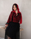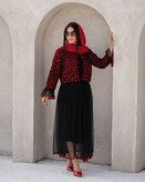 کت: این کت کوتاه و شیک، از پارچهای با طرحهای چشمنواز و سنتی گلیمی تهیه شده است. پارچه گلیمی با نقوش مشکی و قرمز درخشان، نمادی از اصالت و گرمای شب یلدا است و بر تن شما وقار و زیبایی مینشاند. لبههای آستین با ظرافت خاصی چیندار شدهاند تا حرکت و جلوهای دلربا به استایل شما ببخشند.