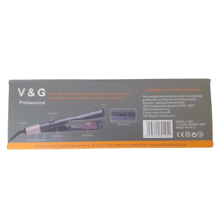 اتو مو مولتی استایلر وی اند جی مدل v-601 (V&G Professional Multi Styler Model v-601) یک دستگاه فوق العاده ایده آل برای صاف و یا فر کردن موهای شما به منظور استفاده ی سالنی و یا شخصی می باشد. دارای صفحات سرامیکی با کیفیتی است. وجود این صفحات باعث می گردد تا موقع استفاده، موهای شما با حالتی نرم، ابریشمی و براق آرایش شوند. سیم برق این دستگاه دارای این قابلیت است که در انتهای دستگاه به صورت 360 درجه قابل چرخش می باشد. این ویژگی به مصرف کننده این امکان را می دهد تا به راحتی و در زوایای مختلف از دستگاه استفاده نماید. محدوده دمای این دستگاه ویوو بین 100 درجه تا 230 درجه سانتی گراد است که با استفاده از این محدوده دما به راحتی موها را می توانید ویو کنید. توسط ویو وی اند جی شما می توانید موهای خود را در زمان کمتر و با سرعت بیشتری ویو نمایید. مشخصات: مولتی استایلر (صاف کننده-فرکننده) دارای صفحه ی سرامیکی نمایشگر درجه حرارت LED گرم شدن در 30 ثانیه تنظیم درجه حرارت (100 الی 230درجه) قدرت دستگاه: 45وات طول سیم: 2متر دارای عایق حرارت قابلیت تنظیم دما قابلیت گرم شدن به طور یکسان مقاوم در برابر حرارت در استفاده های طولانی